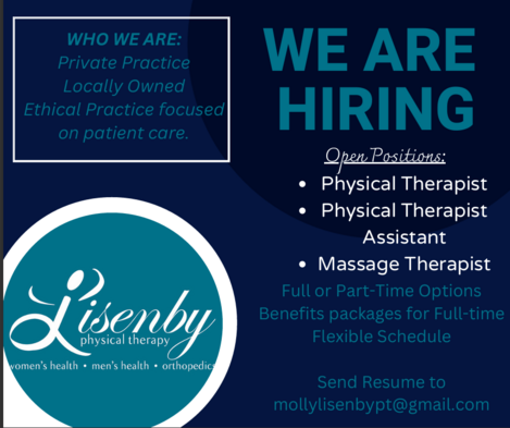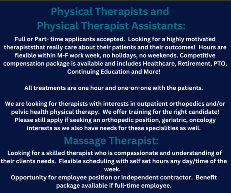 Experience in or desire to work with pelvic health patients is preferred but not mandatory. Training is available for those interested. Orthopedic positions available.